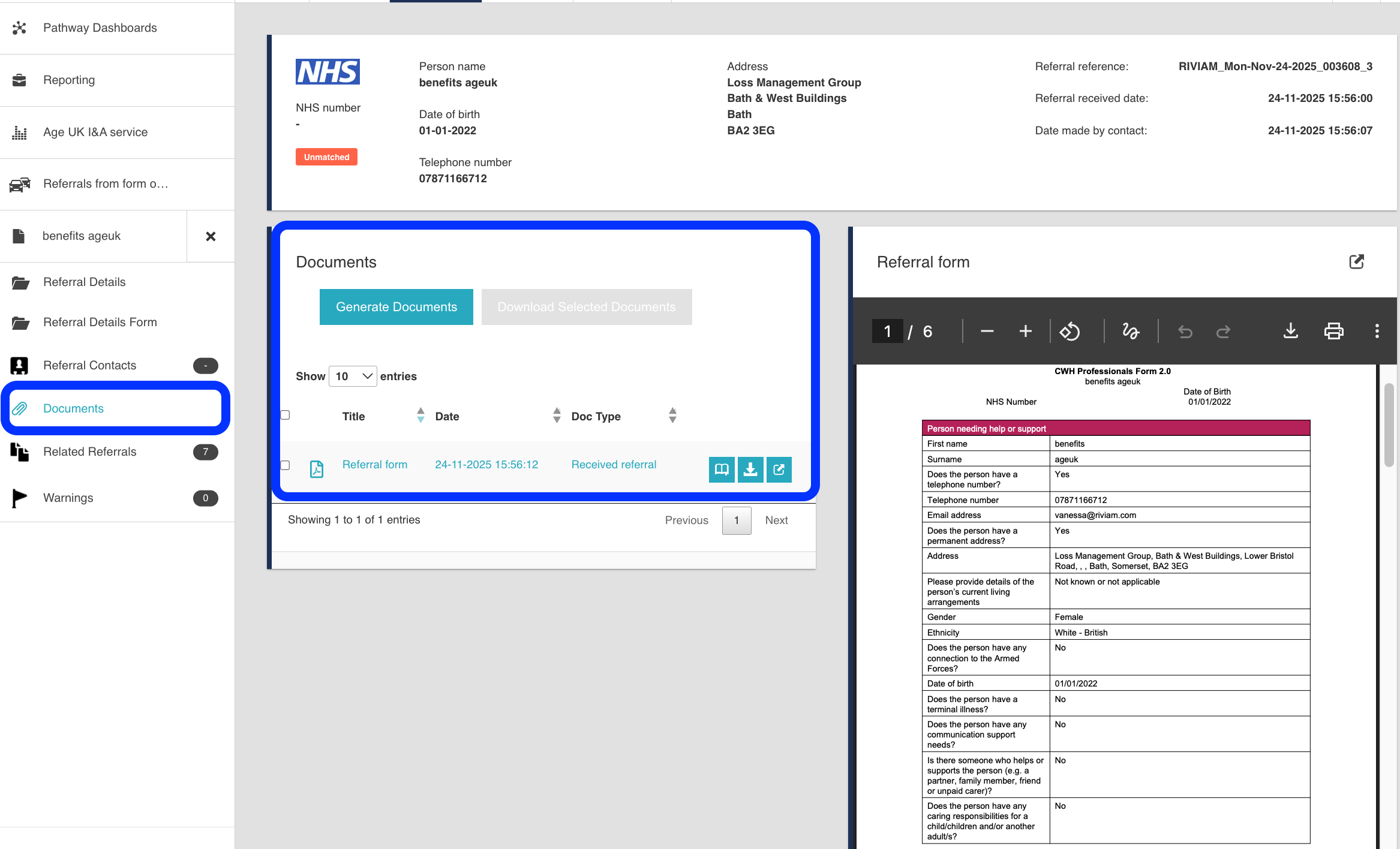 In this section, the user can view the list of documents that have been added to a referral. Tick the document you would like to view, and the referral form will load in the viewer on the right-hand side.