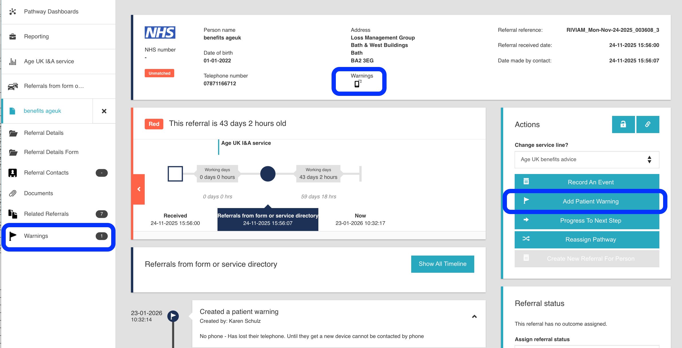 Patient Warnings provide immediate visibility of critical conditions and support tailored, timely care. Authorised users can add or remove Patient Warnings as needed. A warning can be added from the referral navigator using the ‘Add Patient Warning’ button in the right-hand menu. When selected,