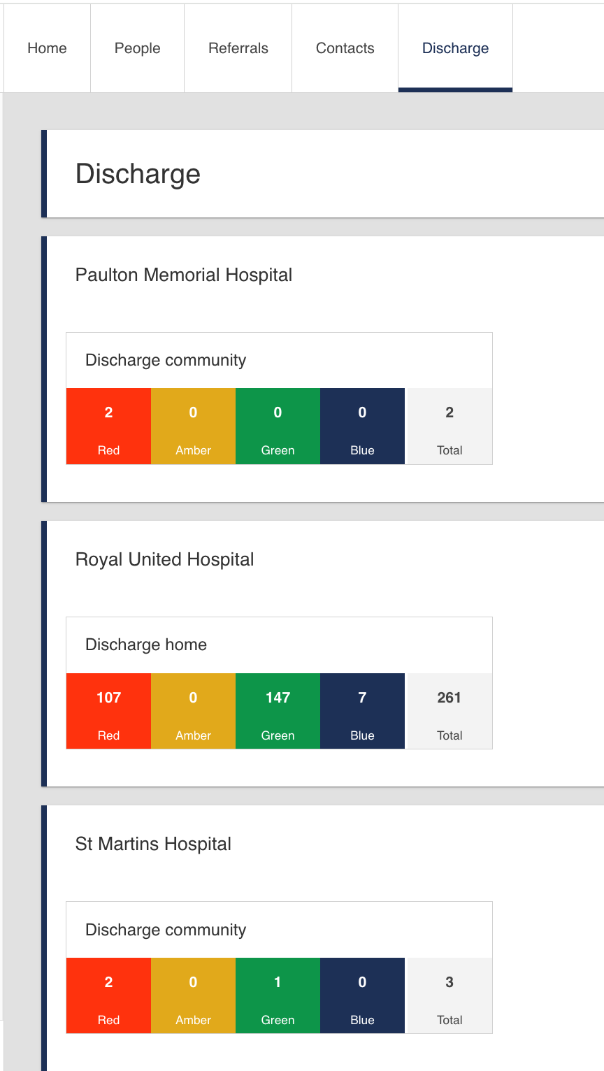The Discharge page will list the organisation and the discharge home pathway. It will provide a count of the number of referrals with a red, amber, green, or blue status and the total number of referrals in grey.