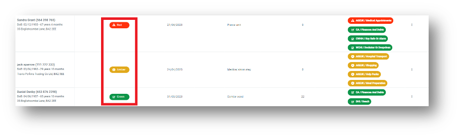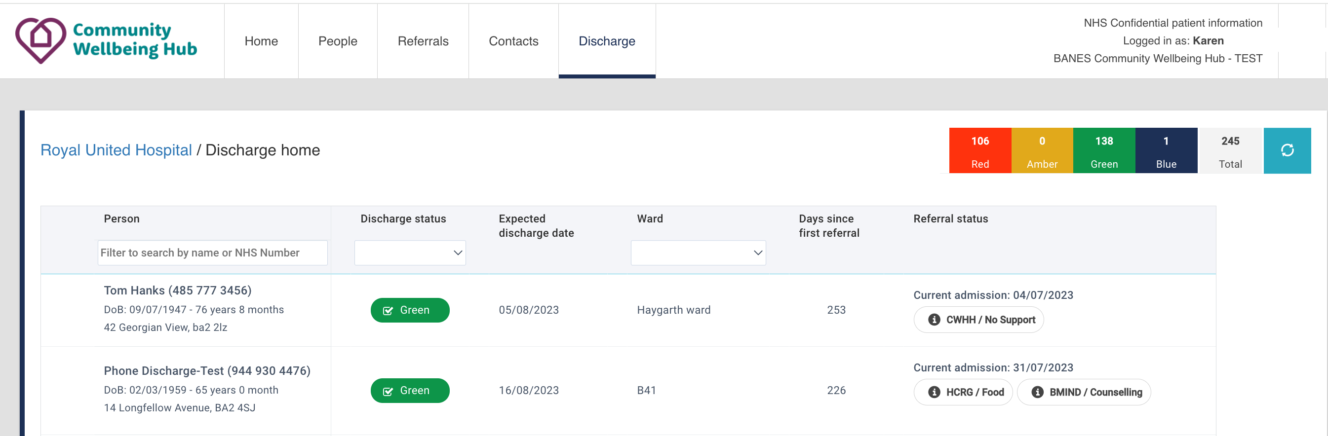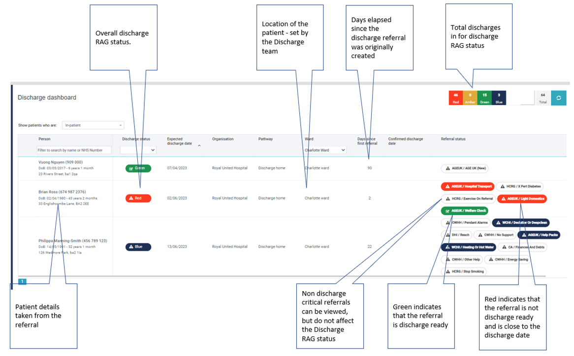 The Discharge dashboard calculates an overall Discharge RAG status for each person.