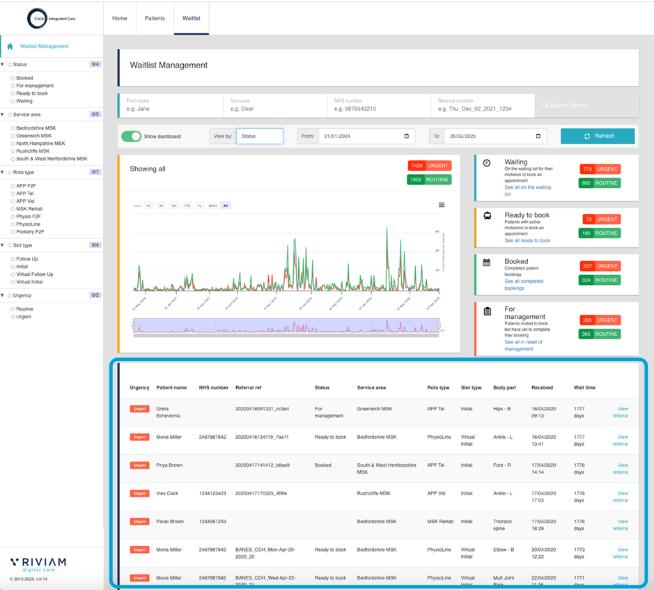 The list includes the patient's name, NHS number, the time when the referral was received and the wait time.