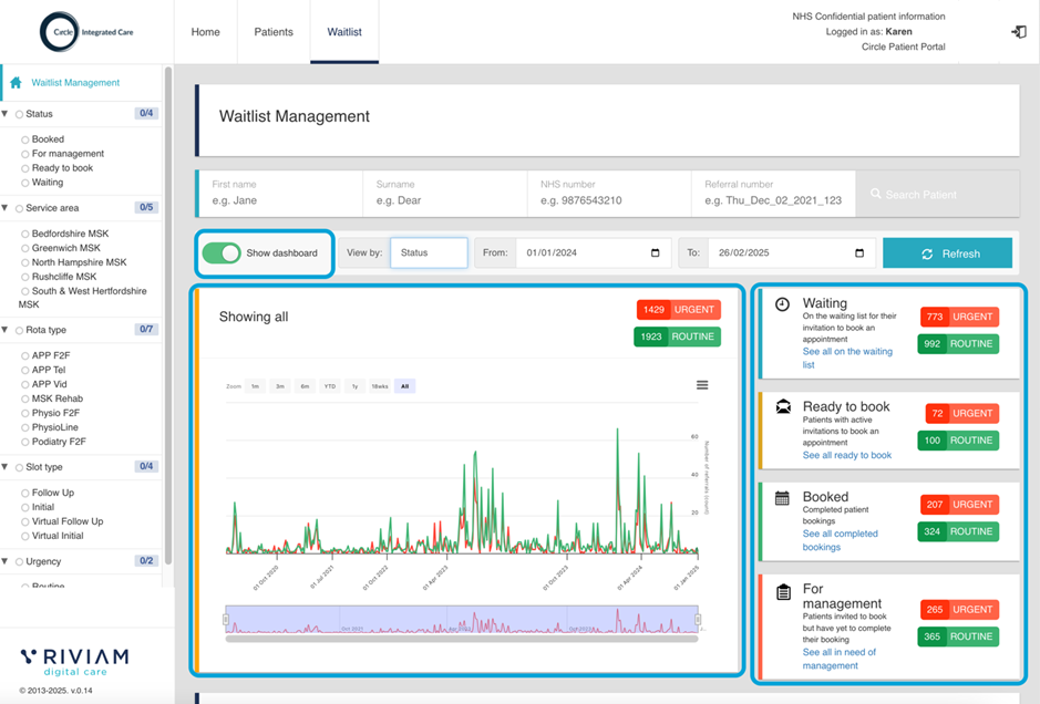 The default view for the central graph presents the complete list of appointments; however, clicking on any ‘see all’ links in status cards on the right-hand side will update the central graph. Alternatively, you can also select the green Routine or red Urgent buttons to update the central graph.