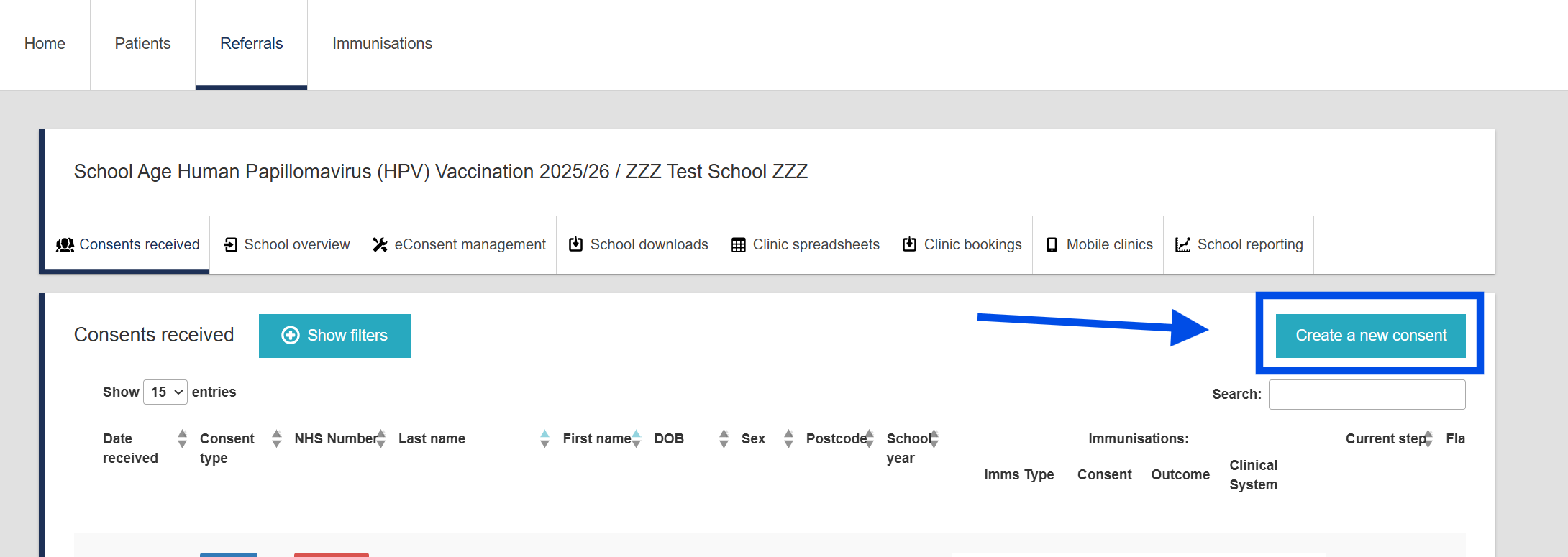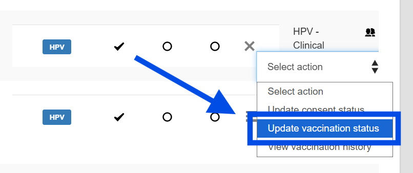 The clinic staff can create a consent form for the child by talking with the adult who has parental responsibility. They can use the eConsent link to create new consent into RIVIAM Web, perform any triage and can vaccinate them, as appropriate. This outcome can be recorded directly into RIVIAM Web using Update vaccination status.