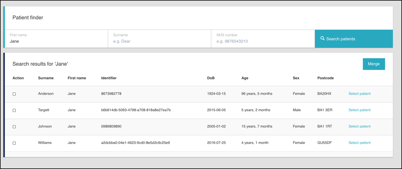 Use the patient finder to search for a patient by entering their first name and last name or NHS number, then click 'Search patients’. The search will bring up a list of patients that match the criteria as shown below.